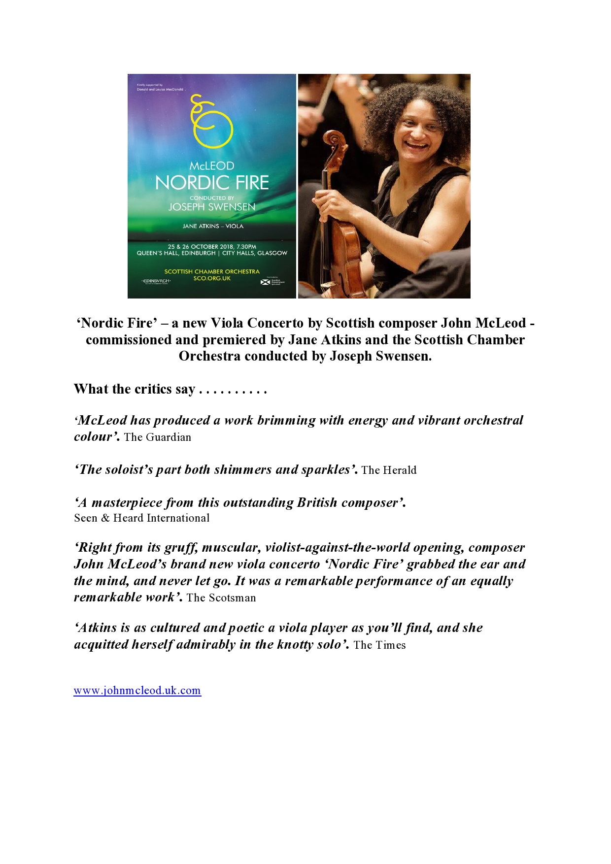 Looking ahead, 25th October (Queen’s Hall, Edinburgh) and 26th October (City Halls, Glasgow) see the first performances of McLeod’s Nordic Fire – Concerto for Viola and Orchestra, commissioned by the SCO for the brilliant viola player Jane Atkins. The title refers to the amazing light, color,r and energy of the aurora borealis – that natural electrical phenomenon characterized by the appearance of streamers of reddish or greenish light in the sky, especially near the northern magnetic pole. It will be conducted by Joseph Swensen.